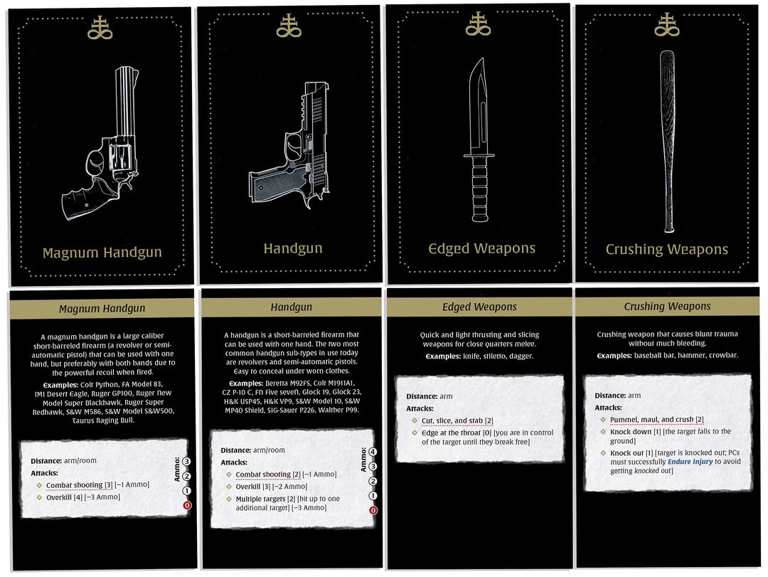The Weapon Deck for KULT: Divinity Lost consists of 55 cards with rules, information, and illustration of both completely new as well as previously presented weapons and gear, such as the assault rifle, shotgun, explosives, flashbang grenades, heavy body armor, magnum handgun, pocket pistol, Molotov cocktail, and many more. The deck facilitates for the players and the Gamemaster with easy reference to applicable rules and data.