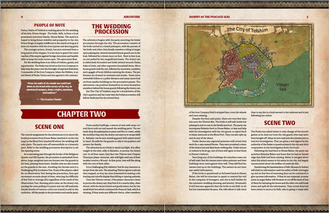 Written by Devinder Thiara, Dowry of The Peacock Seal puts the players into the ranks of the Iron Company, protecting a noble wedding procession through the city of Telshim. However, not all is as it seems, as deception and fear take a hold of the celebrations.